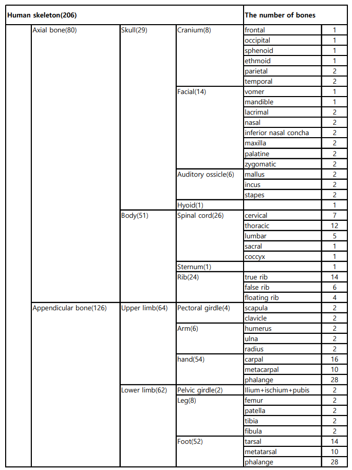 인간뼈(human skeleton) 206개는 몸통(axial)뼈 80개와 사지(appendicular)뼈 126개로 나뉜다.
