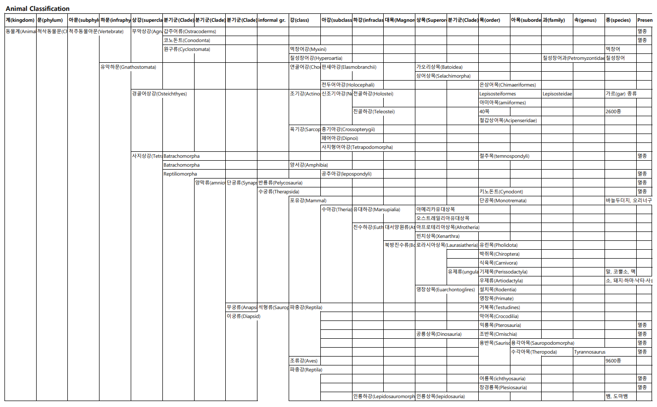 포유류, 공룡의 분류이다. 분류체계는 문(phylum)-강(class)-목(ordert)-과(family)-속(genus)-종(species)을