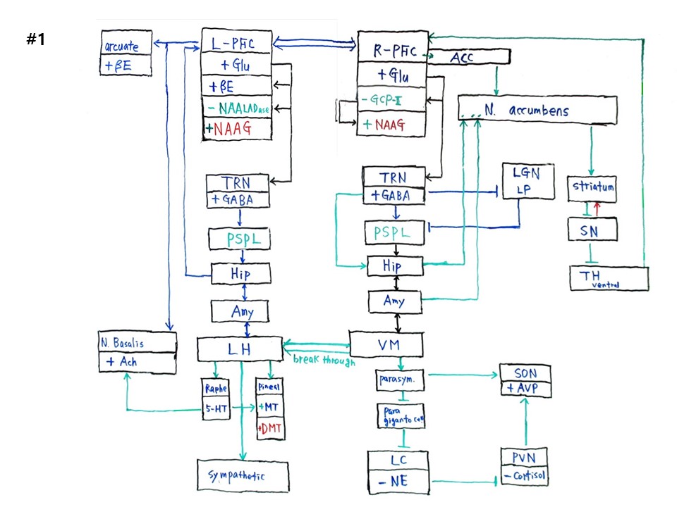 은 오른쪽은 공간좌표를 설정하고 왼쪽은 바디좌표를 만들어낸다. 다음은 해마(Hip), 편도체(amy), 시상하부 외측(LH, lateral hypothalamus)이다. 다음은 솔기핵(Raphe)에서 세로토닌(5-HT)이 나온다. 다음은 송과체(Pineal
