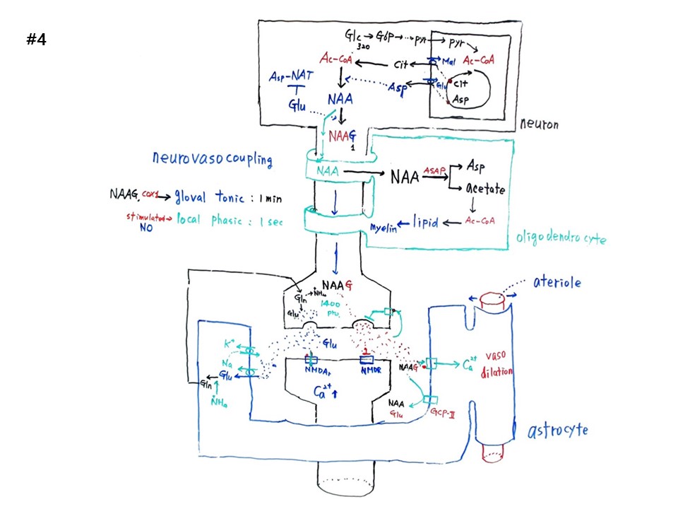칼슘이온이 방출되고 혈관팽창(Vaso dilation)이 일어난다. 커플링이다. 글루코스가 320개 분자가 들어가면 통상적으로 NAAG 1분자 생긴다. 통상적으로는