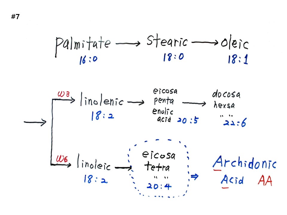 팔미트산(Palmitate)은 탄소수가 16개이고, 이중결합이 0이다. 한번 더 돌리면 탄소수가 18개이고 이중결합이 0인 스테아르산(stearic acid)이 되고, 한번 더 돌리면 탄소수 18, 이중결합이 1개인 올레익산(Oleic acid)가 된다.