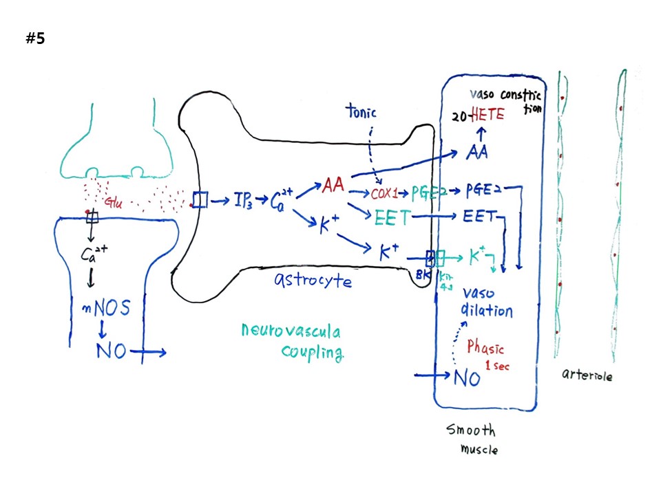성상세포의 이온채널에 Glu가 붙으면 IP3를 트리거 하여 칼슘 주머니인 소포체를 열어 칼슘이 폭발한다. 칼슘에 의해 두 갈래 길을 간다. 한 길은 아라키돈산(AA, arachidonic acid)이다. 페이잘 커플링의 핵심분자이다. 성상세포의 AA는 민무늬근육으로 그냥 들어가기도 하고 또한 성상세포에서 COX1을 트리거 한다. COX1(cyclooxygenase 1) PGE2(Prostaglandin E2)가 되고 PGE2는 민무늬근육으로