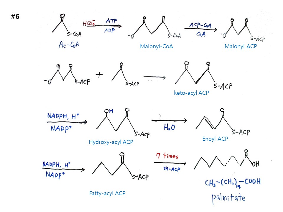 가 된다. 이 과정을 7번 반복하고 S-ACP가 빠져 나오면 이 분자가 유명한 팔미트산(palmitate)