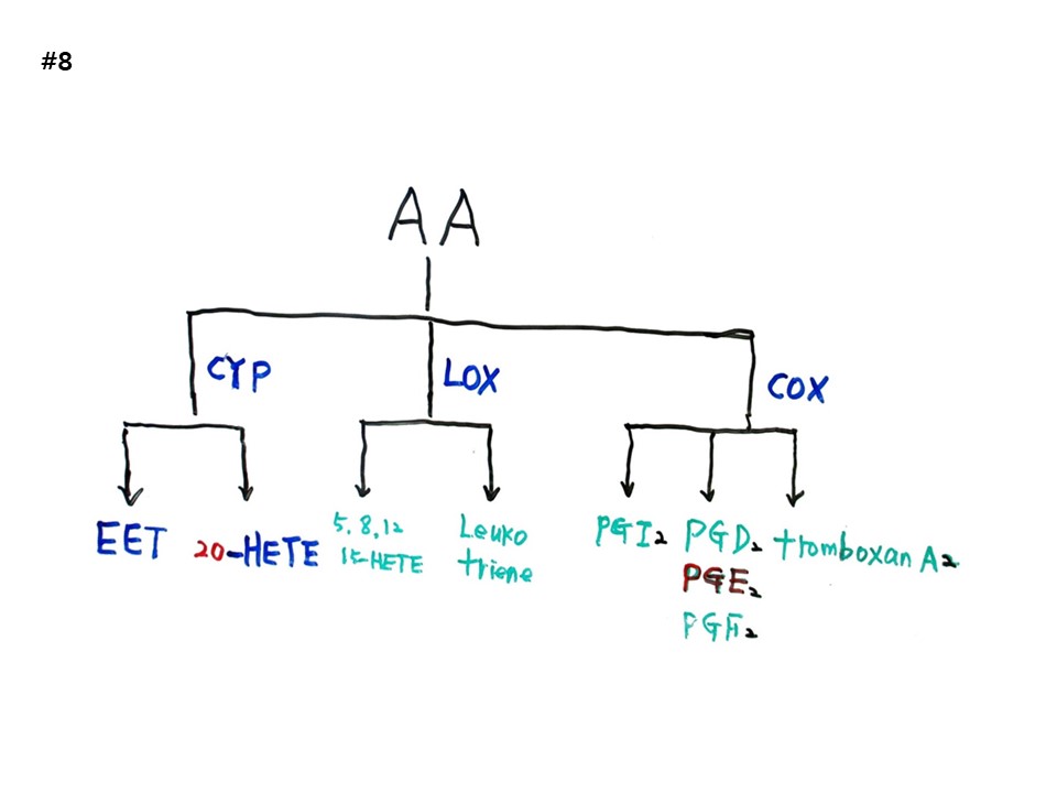 갈래는 CYP효소가 작용하여 EET 20-HETE가 나온다. 두번째 갈래는 LOX효소가 작용하여, 5, 8, 12, 15-HETELeukotriene이 나오고, 세번째 갈래는 COX효소가 작용하여 PGI2 PGD2, PGE2, PGF2, Tromboxane